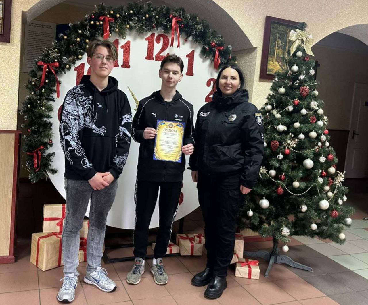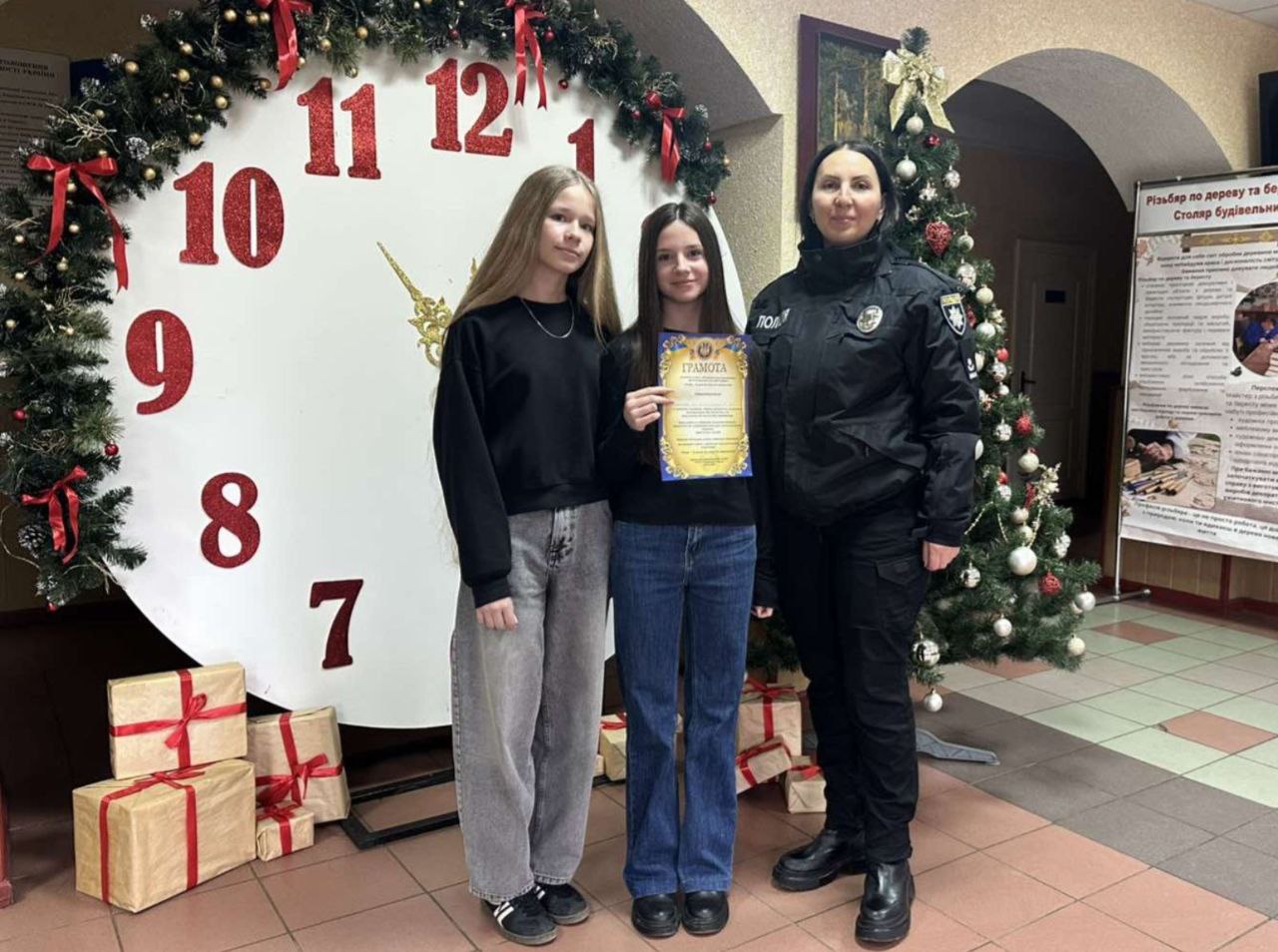 У ДНЗ "Дубенське ВХПТУ" інспектор сектору ювенальної превенції м.Дубна підполковник поліції Юлія ПАСІЧНИК відзначила творчі колективи групи 15 та 35 (професія "Оператор з обробки інформації та програмного забезпечення") за активну участь у творчому конкурсі відеосюжетів у рамках Всеукраїнської акції "16 днів проти насильства".